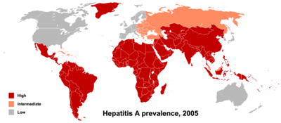 Dans les pays en développement, et dans les régions où les conditions d'hygiène sont mauvaises, l'incidence de l'infection par le virus est proche de 100% et la maladie est le plus souvent contractée dans la petite enfance. L'infection par le virus de l'hépatite A ne provoque aucun signe clinique ni aucun symptôme décelable chez plus de 90% des enfants et du fait que l'infection confère une immunité à vie, la maladie ne présente pas une importance spécifique pour la population autochtone. En Europe, aux États-Unis et dans les autres pays industrialisés, par contre, l'infection est contractée essentiellement par les jeunes adultes non immunisés, dont la majorité sont infectés par le virus au cours de voyages dans des pays présentant une forte incidence de la maladie. [3]